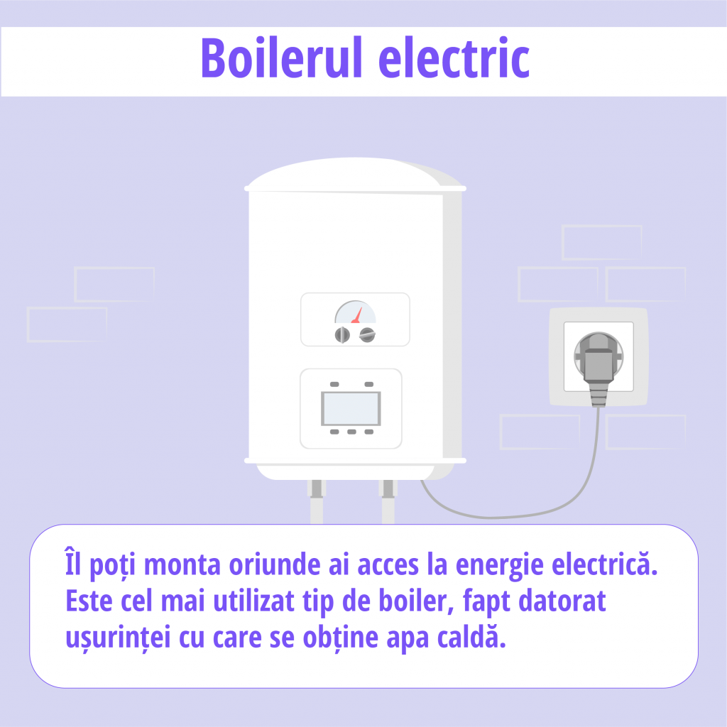 Este în mod cert cel mai utilizat tip de boiler, fapt datorat ușurinței cu care se obține apa caldă. Tot ce trebuie să faci este doar să-l conectezi la rețeaua electrică, iar încălzirea apei se va realiza cu ajutorul rezistențelor electrice. Avantajul acestui tip de boiler este faptul că îl poți monta oriunde ai acces la energie electrică, fără a avea nevoie de spațiu special sau de aprobări suplimentare.