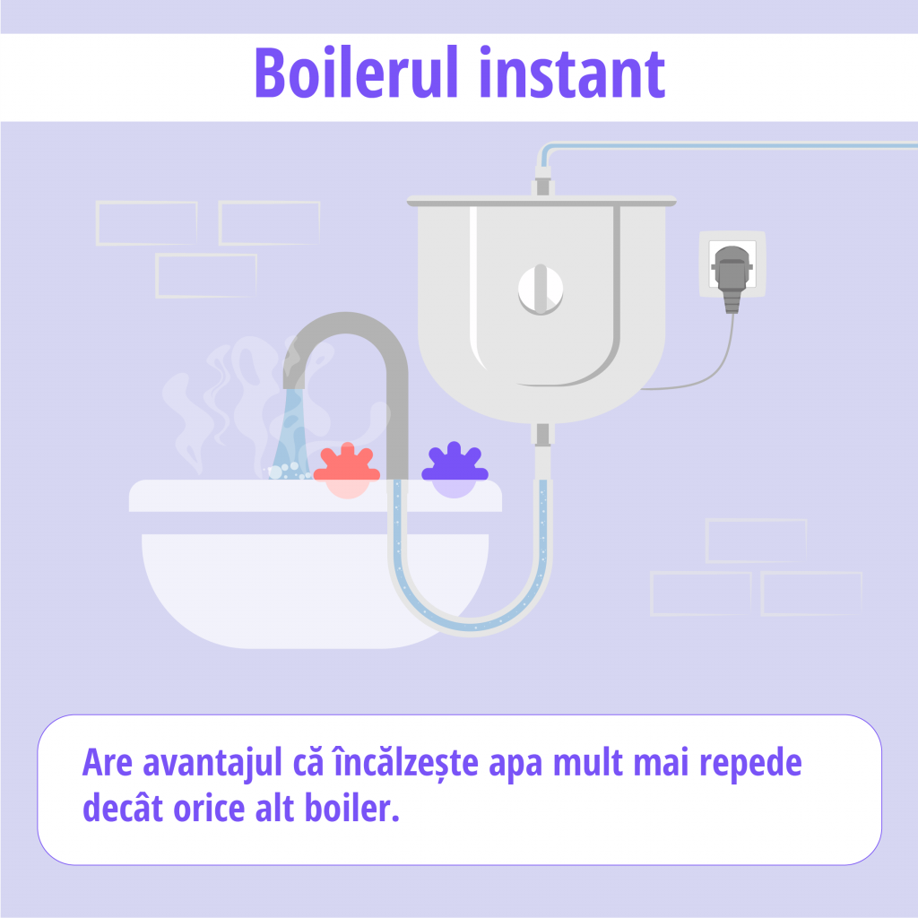 - Timpul de încălzire al apei – dacă vrei să ai apă caldă cât mai repede, atunci poți alege un boiler instant.