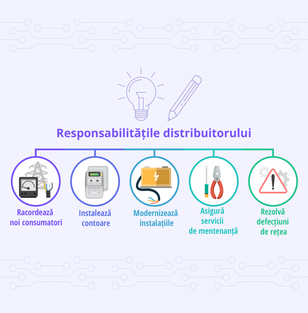 Distribuitorul are responsabilitatea să racordeze noii consumatori, să instaleze contoare și să ofere servicii de mentenanță sau să facă investiții pentru modernizarea instalației. Tot distribuitorul este responsabil să intervină atunci când sunt defecțiuni la rețea. Drept urmare, către el trebuie să direcționezi reclamațiile sau plângerile atunci când sunt întreruperi.