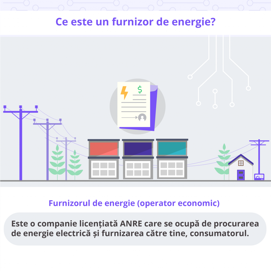 Un furnizor de energie reprezintă o companie care se ocupă cu vânzarea de energie electrică către consumatorii finali și oferă serviciile aferente de racordare și mentenanță. Furnizorul vinde energie electrică spre consumatori, deci către el vei plăti factura la lumină. Tot cu furnizorul vei încheia contractul de alimentare cu energie.