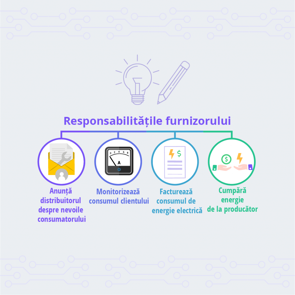 Anume furnizorul analizează în mod constant consumul clienților și să cumpere energia necesară de la producător. El utilizează rețeaua de distribuție a distribuitorului sau distribuitorilor cu care colaborează, pentru transmiterea energiei electrice către toate punctele de consum pe care le are (locuințe, birouri, magazine etc).