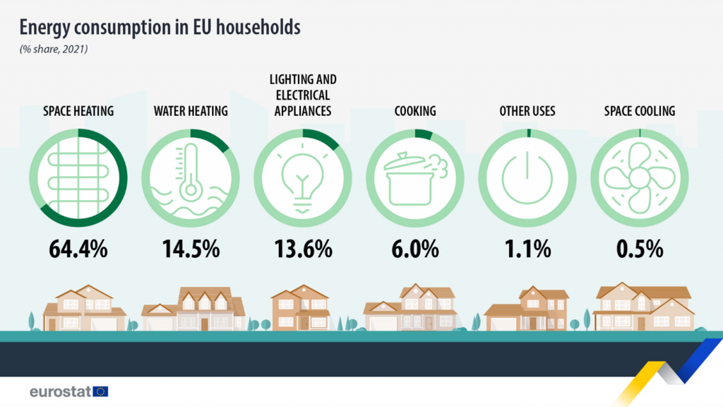 Principala utilizare a energiei de către gospodăriile din UE în anul 2021 a fost pentru încălzirea locuințelor (64,4% din consumul final de energie în sectorul rezidențial), urmată de încălzirea apei (14,5%), iluminat și funcționarea aparatelor electrice, potrivit datelor Eurostat.
