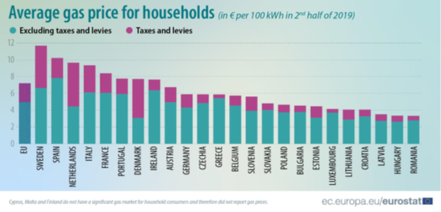 Impozitele şi taxele au reprezentat 31% din preţul gazelor naturale în a doua jumătate a anului 2019. Cea mai mare pondere a impozitelor şi taxelor în preţul gazelor naturale se regăseşte în Danemarca şi Olanda, iar cea mai redusă în Grecia şi Luxemburg.