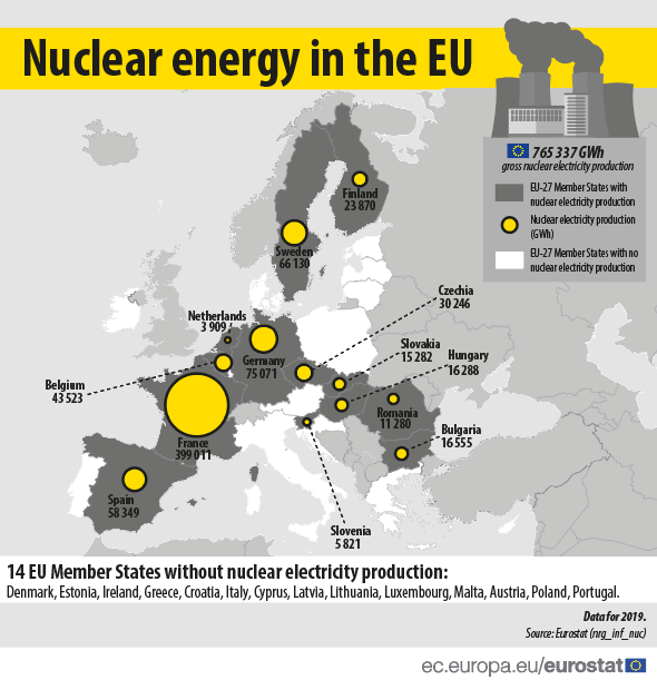 Cel mai mare producător de energie nucleară din UE a fost Franța, cu 399.011 GWh (52,1% din totalul UE), urmată de Germania (75.071 GWh adică 9,8%), Suedia (66.130 GWh sau 8,6%) și Spania (58.349 GWh, respectiv 7,6%).